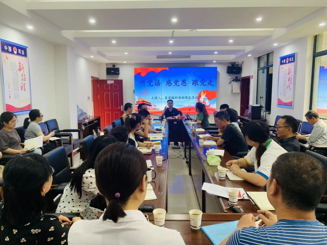 6月17日上午,县委组织部副部长、县委两新工委书记李远胜以《听党话 感党恩 跟党走》为主题,在县司法局讲授专题党课,机关支部全体党员、入党积极分子、离退休人员支部书记、律师支部书记共30余人参加学习。
