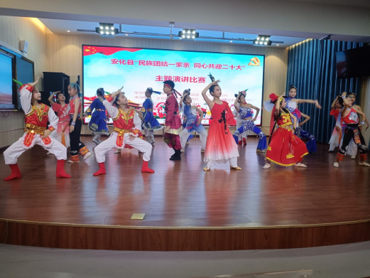 智育加德育 系好人生的第一粒扣子 根据学生不同年龄阶段身心发展的特点出发,分阶段、分层次、有重点、有针对性地在语文课和道德与法治课等主课程中设置具体民族团结教育内容,将其贯穿到教学育人全过程中,发挥好课堂教学主渠道的作用,让学生们在优美的字里行间增强对中华民族的归属感和自豪感,感受到民族团结的磅礴力量。同时还开设有涉及民族团结教育的歌唱、舞蹈等艺术课,如民族舞蹈《站在草原望北京》等。将民族团结进步教育与德育活动相结合,采取张贴宣传标语、出主题黑板报和手抄报、开展国旗下的演讲、发放宣传资料、举办“民族团结一家亲 同心共迎二十大”演讲比赛等方式,在校园营造了民族团结进步教育的浓厚氛围。另外,梅城完小还在校运动会、元旦晚会等重大活动中创新性融入民族团结进步教育元素,起到了润物细无声的效果。