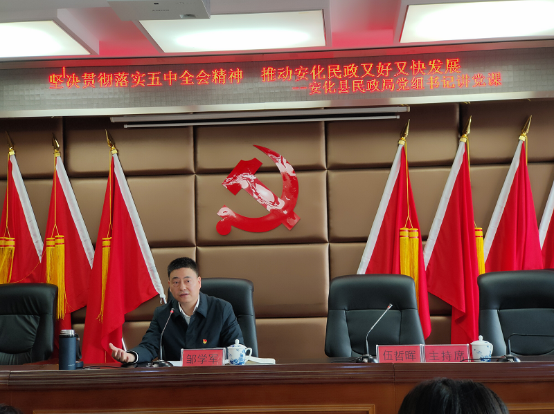 2月23日,安化县民政局召开党员大会,机关支部全体党员参会。 会上,全体党员重温了入党誓词,局党组主要负责人讲授专题党课《坚决贯彻落实五中全会精神 推动民政又好又快发展》,随后组织党员集中学习非法集资相关知识、《习近平谈治国理政》第三卷、《中国共产党章程》《中共中央关于加强党的政治建设的意见》等重要内容。最后,与会党员填写《评议党组织书记测评表》《民主评议党员测评表》,对支部书记全体党员进行了民主测评。 会议指出要充分认识党的十九届五中全会的重大意义,全面领会全会精神的深刻内涵,准确把握五中全会对民政工作的新部署、新要求,立足“五个围绕”:一是围绕加强党的领导,建设更具效能的民政;二是围绕基本的民生保障,建设更有质感的民政;三是围绕基层社会治理,建设更接地气的民政;四是围绕基本社会服务,建设更贴民心的民政;五是围绕全面深化改革,建设更有活力的民政,将五中全会精神作为今后开展民政工作的方向指引,确保工作任务按时保质完成。
