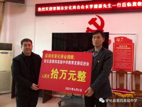 2021年4月2日,深圳市安化商会向安化四中捐款十万元。