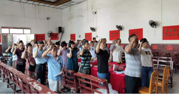 在主题党日活动中,全体党员重温了入党誓词。老干党总支书记回顾了上届党总支的工作,认为上届党总支的工作开展是积极有为的,全体老干部发挥余光余热,全力支持镇党委政府的工作,充分发挥了党建引领的作用。