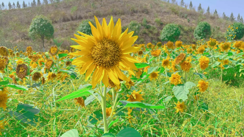 花海里,绽放的向日葵总是以温暖示人,呵护希望。一片片黄橙橙,金灿灿,流光溢彩,耀眼夺目;高高的杆子顶着圆圆的葵花,冲着太阳微微点头;花盘上,唱歌的蜂,翩跹的蝶,飞舞的蜻蜓,千姿百态,唯美动人。